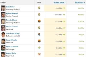 西甲身价涨幅榜:居莱尔+3000万第1 姆巴佩+2000万 费尔明+1000万
