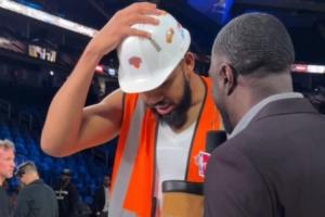 GIF-唐斯赛后头戴安全帽,身穿建筑背心接受采访