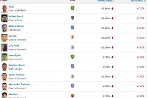 24直播网12月17日讯 德转会12月17日更新中超球员身价,古加与布尔克并列下降最多,均降70万欧。克雷桑、阿苏埃等球员身价也出现不同程度下滑,多位外援价值缩水。