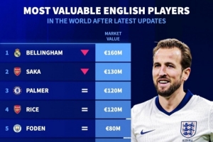 24直播网12月19日讯 《转会市场》更新了德甲球员身价及英格兰球员身价榜。贝林厄姆以1.6亿欧元居首,萨卡(1.3亿)、帕尔默与赖斯(均1.2亿)紧随其后。福登(8000万)位列第五,罗杰斯、阿诺德等7000万,凯恩等三人6500万。