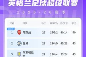 最新的积分榜方面:阿森纳7分领跑,暂排第2的曼城本轮在曼市德比中0-2不敌曼联,先赛的情况下与维拉同积43分。明晨维拉主场迎战埃弗顿,只要不败就能升至第2。