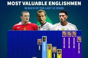 24直播网01月24日讯 德媒盘点近15年英格兰最高身价球员。鲁尼、斯特林、凯恩曾占据榜首,而贝林厄姆已连续五年位居榜首,其身价在2023至2025年间达到峰值1.8亿欧元,展现了其顶级市场价值。