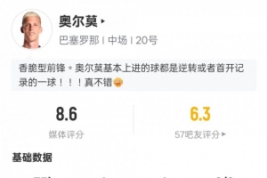 体育资讯1月26日讯 西甲第21轮,巴萨主场迎战皇家奥维耶多。奥尔莫首发出战,传射建功,另外他还有1次过人和1次关键传球,评分8.6。