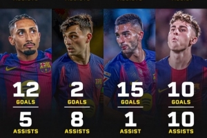24直播网01月26日讯 西甲第21轮,巴萨主场3-0大胜。数据显示,队内多达8名球员本赛季参与进球超10次,多点开花。其中,费兰·托雷斯以15球1助领衔,莱万与亚马尔也各入11球,展现强大攻击火力。