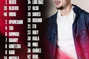 1-诺伊尔、26-乌尔赖希、40-乌尔比希、2-于帕梅卡诺、4-若纳坦·塔、6-基米希、7-格纳布里、8-格雷茨卡、9-凯恩、10-穆西亚拉、11-尼古拉斯·杰克逊、14-路易斯·迪亚斯、17-奥利塞、19-阿方索·戴维斯、20-比朔夫、21-伊藤洋辉、23-博伊、30-基亚拉、36-迈克、38-查维斯、42-卡尔、45-帕夫洛维奇
