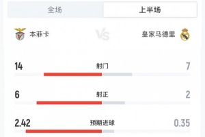 24直播网01月29日讯 欧冠联赛阶段第8轮,本菲卡半场2-1领先皇马。数据显示,本菲卡射门、射正、预期进球及得分机会均占优,控球率37%落后于皇马的63%。尽管皇马传球成功率更高,但本菲卡凭借更强的进攻效率占据主动。